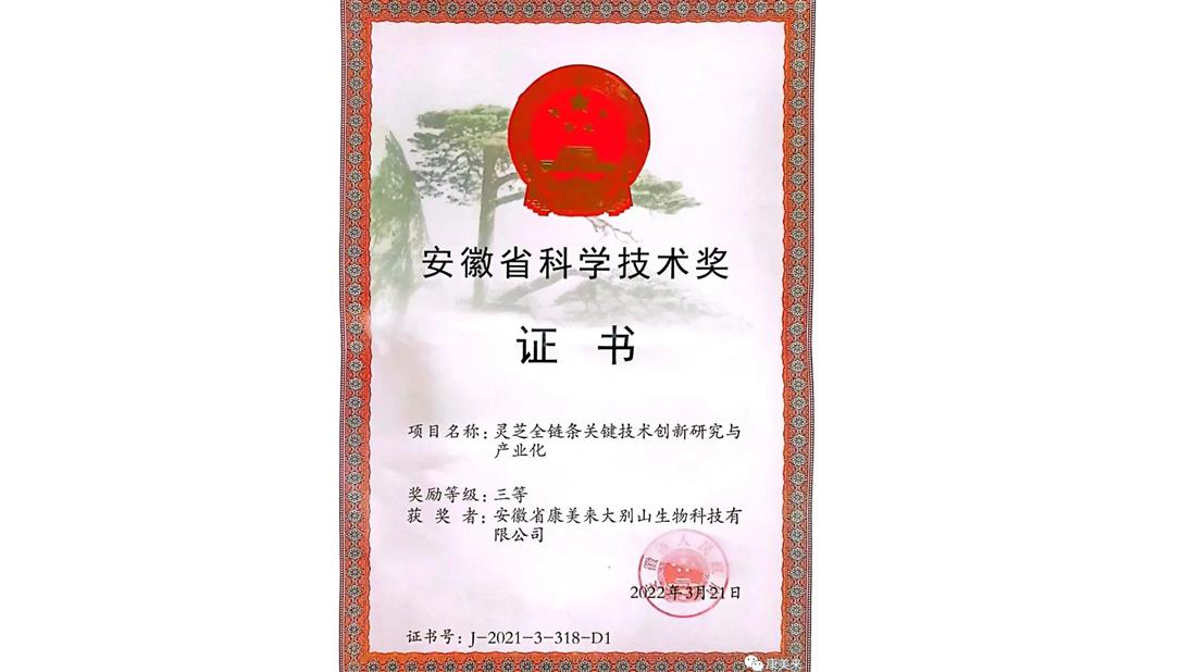榮獲:安徽省靈芝產(chǎn)業(yè)工程技術(shù)研究中心