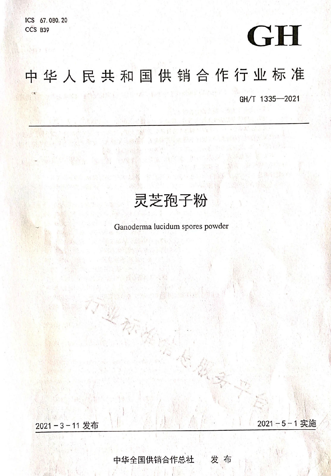 近日,中華全國供銷合作總社發(fā)布“中華人民共和國供銷合作行業(yè)標(biāo)準(zhǔn)”GH/T 1335-2021靈芝孢子粉,2021年5月1日正式實施。安徽省康美來大別山生物科技有限公司是該標(biāo)準(zhǔn)起草單位之一。
