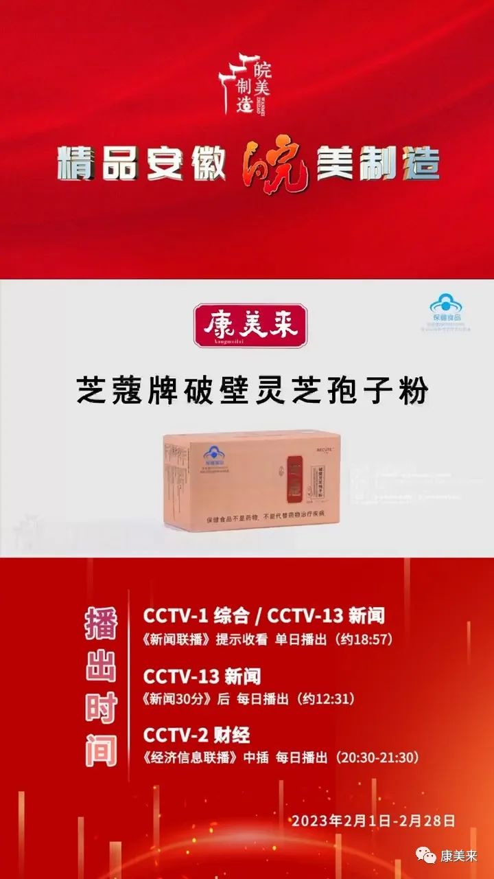 2月1日,康美來破壁靈芝孢子粉登陸央視CCTV1、CCTV新聞、CCTV2等黃金頻道播出廣告,這是繼2022年11月后時隔2個月再次在央視三個黃金頻道黃金時間推廣公司和產品,以“精品安徽”大品牌的形象廣告全國。