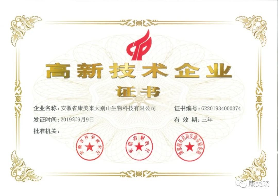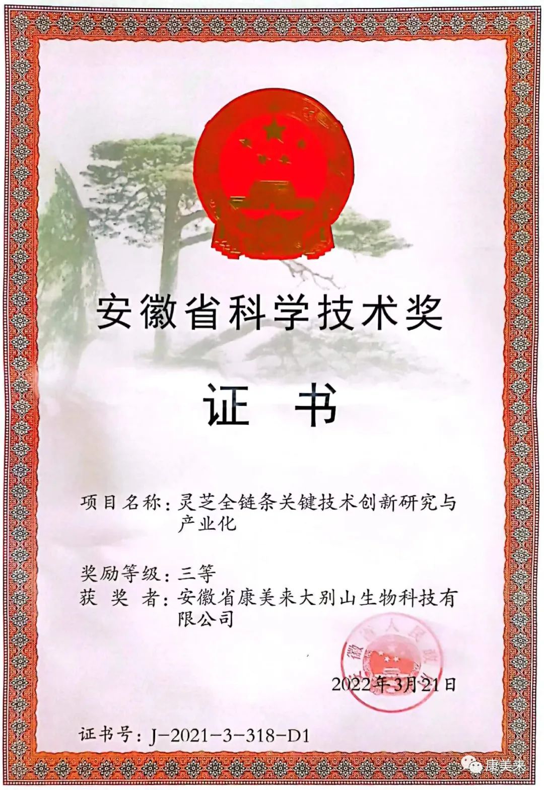 安徽省人民政府向安徽省康美來大別山生物科技有限公司、安徽大學沈業壽教授等單位和個人頒發“安徽省科技技術獎”證書,這是康美來公司與安徽大學開展產學研合作十五年在大別山靈芝研究領域取得的重大成就,得到省、市、縣政府的高度肯定。