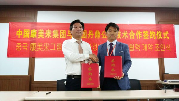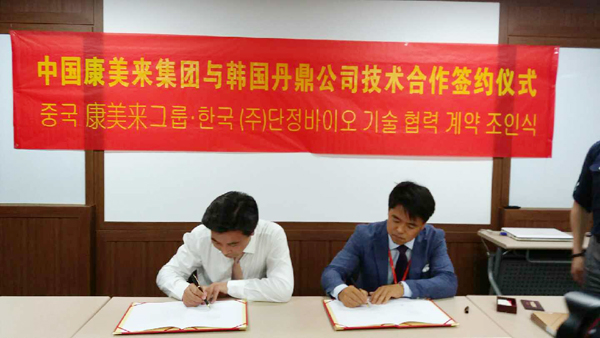7月5日,余春富董事長代表中國康美來集團與大韓民國丹鼎生物科技有限公司董事長鄭義洙簽訂高端產品技術合作協議。