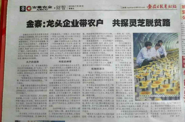 自康美來公司主辦的“2016大別山靈芝文化節(jié)”開展以來,以康美來為龍頭的帶動(dòng)老區(qū)農(nóng)民精準(zhǔn)脫貧產(chǎn)業(yè)模式引起各級政府及主流媒體高度關(guān)注。金寨縣委縣政府最近決定,在全縣范圍推廣康美來吳家店靈芝基地與光伏發(fā)電土地融合的新模式。繼新華社主辦的新華網(wǎng)報(bào)道后,安徽省委機(jī)關(guān)報(bào)《安徽日報(bào)》7月29日在農(nóng)村版報(bào)紙重點(diǎn)報(bào)道,以及走遍中國網(wǎng)、安徽財(cái)經(jīng)網(wǎng)、安徽工人日報(bào)官網(wǎng)<皖工網(wǎng)>等國內(nèi)各大新聞媒體爭相報(bào)道康美來,有力推動(dòng)了以康美來為代表的金寨靈芝的對外宣傳和品牌打造。