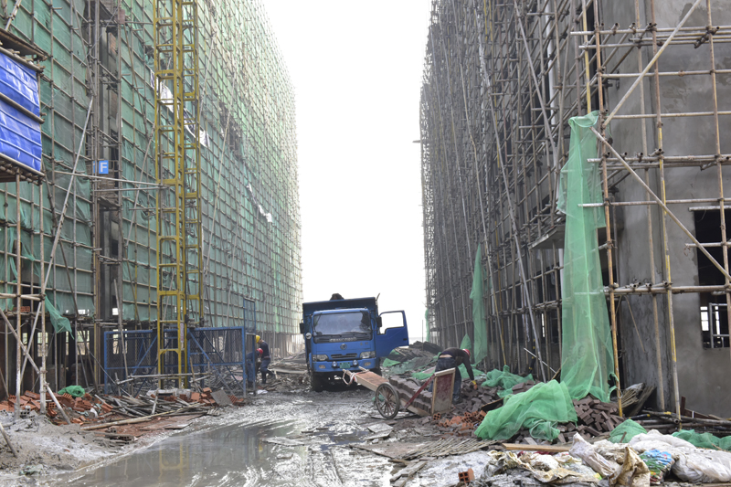 6層高的高檔公寓樓已經完成封頂,腳手架林立,預計2019年3月前完成墻面工程。