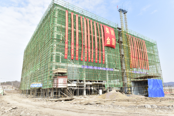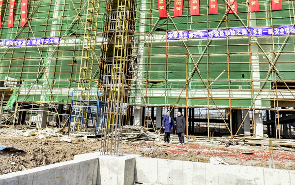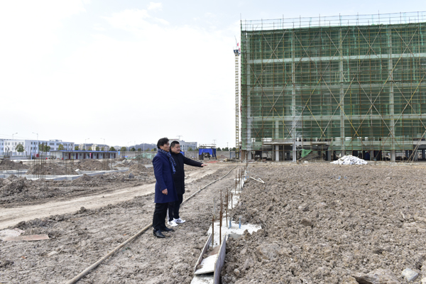 余董重點察看霍山石斛保健品加工車間廠房。目前已建4層,墻上掛滿了封頂大吉的慶賀條幅。
