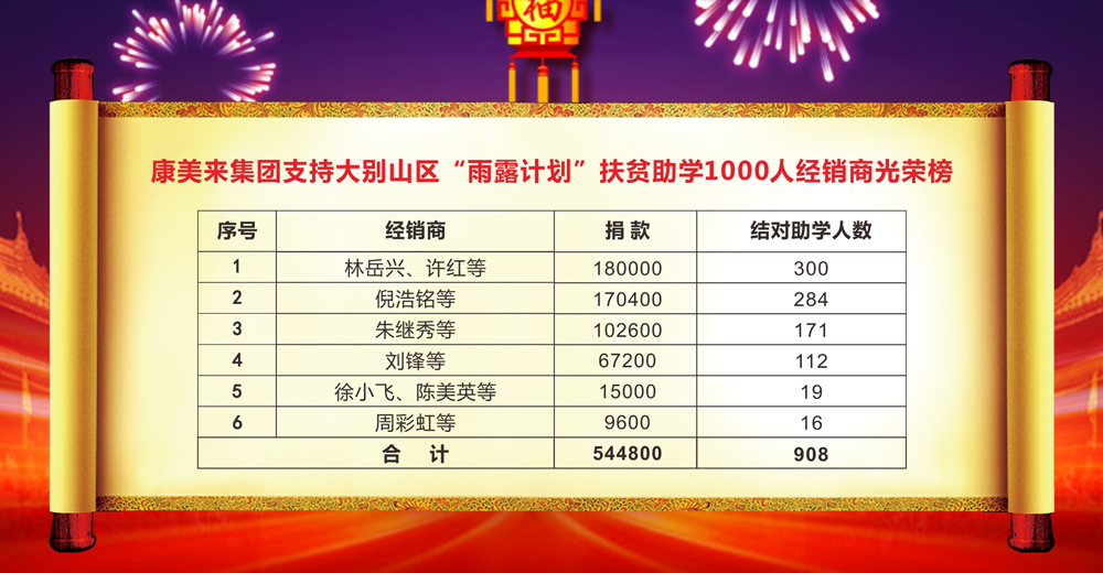 康美來(lái)集團(tuán)廣大經(jīng)銷商和干部職工支持金寨縣政府“雨露計(jì)劃”2019年度實(shí)施扶貧助學(xué)結(jié)對(duì)大別山區(qū)貧困學(xué)生1000人行動(dòng),實(shí)際達(dá)成結(jié)對(duì)1112人,總捐款667200元。現(xiàn)發(fā)布光榮榜,予以表?yè)P(yáng)。