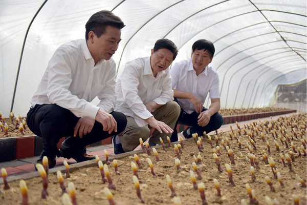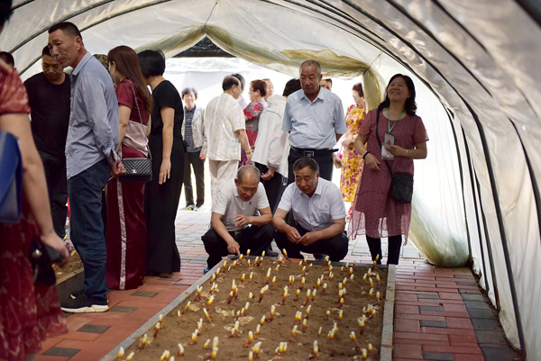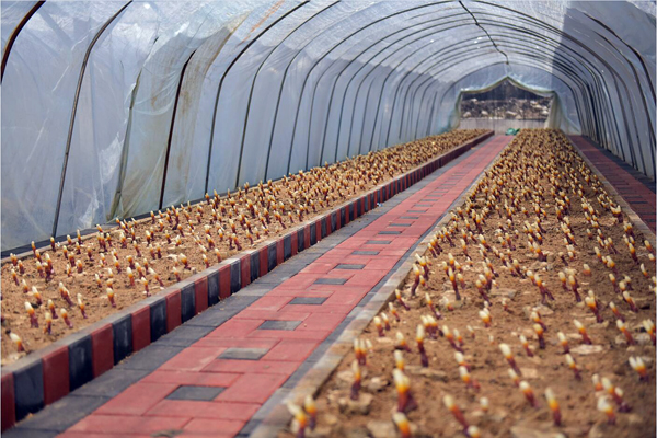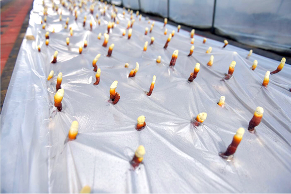 早期栽培的靈芝已長出嫩芽,色澤鮮艷,整齊排列,迎接遠(yuǎn)方的客人。