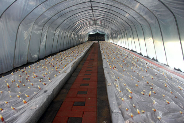 李總介紹,基地靈芝今天將全部完成栽培,由于大別山近期氣溫低,長得慢。