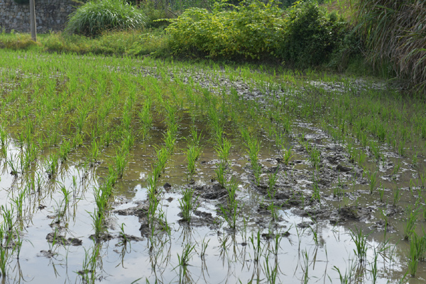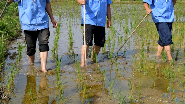 突然,我們看見一群農(nóng)民“傻乎乎”站在稻田里,每人手拿一個桿子,腳在地上不斷地游動,讓司機把車子停下來,我們一探究竟。