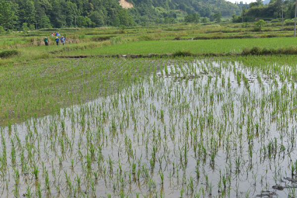 我們來到田邊,詢問大哥,原來他們在人工除草,這是第一次人工除草,是當?shù)刈钤嫉霓r(nóng)業(yè)耕作方法。