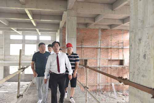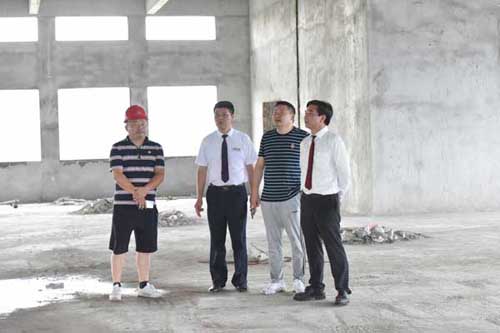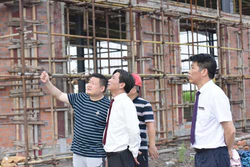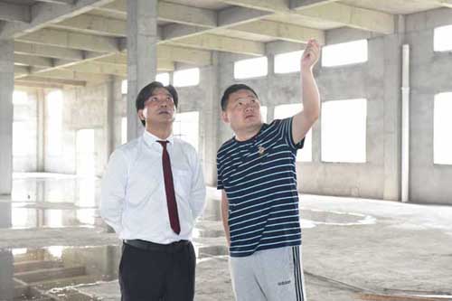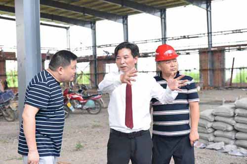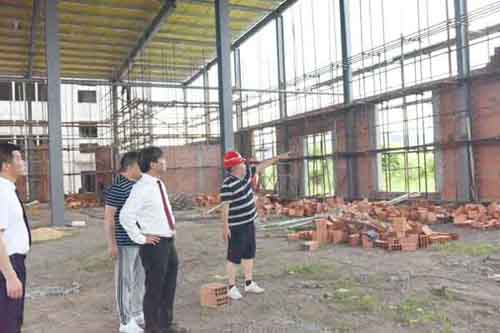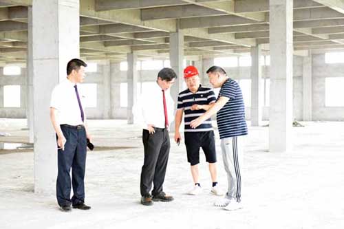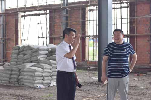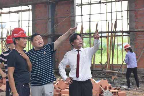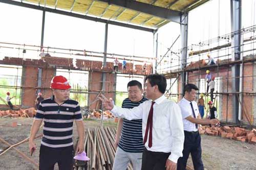 然后余董進入正在建設的第二幢廠房培訓中心。培訓中心鋼結構廠房目前正在墻面施工中,工人們正在壘磚砌墻。