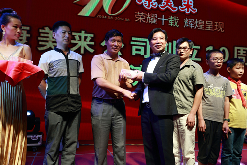 在康美來公司10周年創業輝煌晚會上,余春賦董事長把110400元現金現場捐助給金寨縣沙河鄉中心小學、燕子河鎮樹林小學、青山鎮姜河中心小學184名貧困學生,支持政府雨露計劃。公司自2014年起,發動公司干部和伙伴開展結對扶貧助學,奉獻愛心,回饋社會。2014年由過去的117名,增加到184名學生,由2所小學增加到3所小學。扶貧辦主任劉澤祥參加捐助活動并講話。