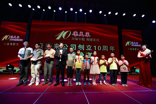 2014年8月,在康美來公司10周年創業輝煌晚會上,余春賦董事長把110400元現金現場捐助給金寨縣沙河鄉中心小學、燕子河鎮樹林小學、青山鎮姜河中心小學184名貧困學生,支持政府雨露計劃。公司自2014年起,發動公司干部和伙伴開展結對扶貧助學,奉獻愛心,回饋社會。2014年由過去的117名,增加到184名學生,由2所小學增加到3所小學。扶貧辦主任劉澤祥參加捐助活動并講話。