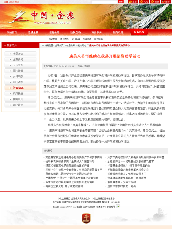 2015年4月23日,我縣現(xiàn)代產業(yè)園區(qū)康美來科技有限公司開展捐資助學活動,縣扶貧辦組織燕子河鎮(zhèn)樹林小學、桃?guī)X鄉(xiāng)關山小學、沙河鄉(xiāng)中心小學三所學校的師生代表參加活動儀式。自2004年到我縣投資靈芝深加工項目成立公司以來,康美來公司連續(xù)9年在我縣開展捐資助學活動,共結對幫扶了184名貧困學生,每年為每名學生捐助600元,直至畢業(yè),總計捐款60多萬元。