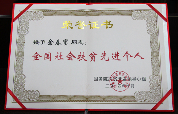 縣扶貧辦積極推崇“康美來精神”。去年全國扶貧日舉行“全國社會扶貧先進個人”推薦活動中,康美來科技有限公司董事長余春富榮獲“全國社會扶貧先進個人”光榮稱號,活動儀式上,縣扶貧辦社會扶貧股股長汪維清為余春富頒發(fā)榮譽證書,對康美來公司的凡人善舉行為表示感謝,并希望余春富董事長帶領各位經銷商老總們,能始終如一地開展捐資助學活動。